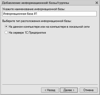 В поле Укажите наименование информационной базы нужно с клавиатуры ввести произвольное название создаваемой базы. Под этим именем информационная база впоследствии будет отображаться в списке информационных баз в окне запуска программы (см. рис. 1.1).