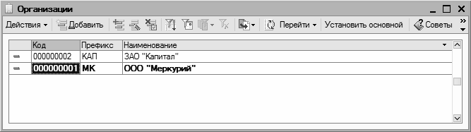 Обратите внимание: в справочнике организаций одна позиция выделена жирным шрифтом. Так обозначается основная организация, которая будет использоваться в программе по умолчанию. Чтобы назначить организацию основной, нужно выделить ее щелчком мыши и нажать кнопку Установить основной.
