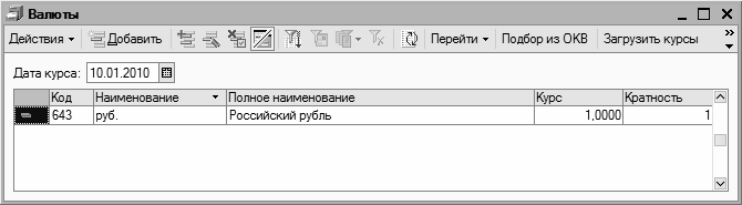 В этом окне содержится список введенных ранее валют. Для каждой позиции списка в соответствующих колонках указываются код валюты, ее краткое и полное наименование, курс и кратность. В качестве краткого наименования можно использовать обозначение валюты (например, USD, RUR и т. д.). Как видно из рисунка, по умолчанию справочник содержит информацию об одной валюте – российском рубле.