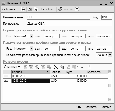 Добавление новой и редактирование текущей валюты можно выполнять как непосредственно в окне списка, так и в специально предназначенном окне редактирования.