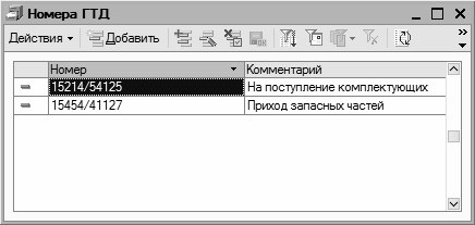 Классификатор номеров ГТД предназначен для хранения номеров всех грузовых таможенных деклараций, по которым когда-либо было поступление импортных товарно-материальных ценностей. Содержимое справочника используется, например, в режиме редактирования номенклатурных позиций.