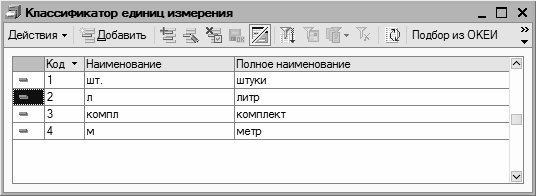 В окне содержится перечень введенных ранее единиц измерения. Для каждой позиции списка в соответствующих колонках указывается ее код, а также краткое и полное наименование.