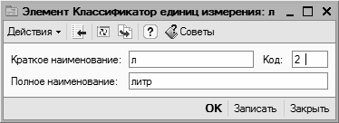 Для создания новой единицы измерения нужно нажать клавишу <Insert> либо выполнить команду Действия | Добавить; для редактирования текущей – нажать клавишу <F2> либо выполнить команду Действия | Изменить. Если включен режим редактирования в диалоговом окне (для переключения режимов редактирования предназначена команда Действия | Редактировать в диалоге), то на экране откроется окно редактирования единицы измерения, которое представлено на рис. 2.8 (в противном случае ввод и редактирование единиц измерения осуществляются непосредственно в окне списка).