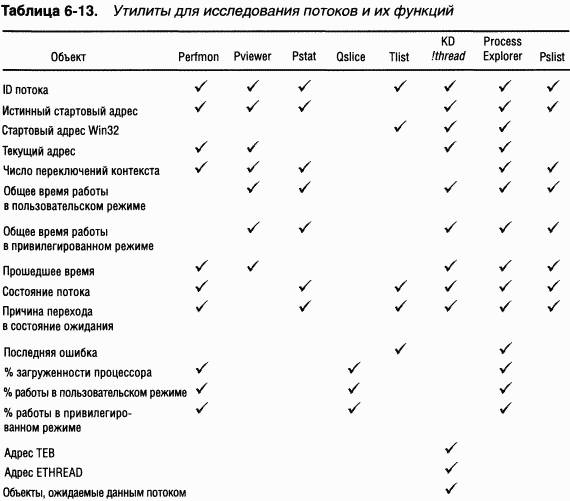 приоритетом, готовый к выполнению. Однако выбор потока для выполнения может быть ограничен набором процессоров, на которых он может работать. Это явление называется привязкой к процессорам (processor affinity). По умолчанию поток выполняется на любом доступном процессоре, но вы можете изменить привязку к процессорам через Windows-функции планирования, перечисленные в таблице 6-14 (см. далее в этой главе), или заданием маски привязки в заголовке образа.ЭКСПЕРИМЕНТ: просмотр потоков, готовых к выполнению