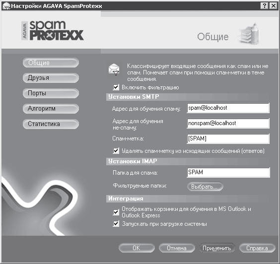 работала оптимально, лучше с самого начала работы с ней заглянуть в свою папку Входящие, выбрать типичные сообщения, которые вы получаете, и сообщить о них программе как о тех, которые не являются спамом. Если вы работаете с Outlook Express или Microsoft Outlook, это можно сделать, просто перетащив письмо в синюю корзинку, которая отображается в правом верхнем углу окна программы. Если вы используете другой почтовый клиент, это займет немного больше времени: необходимо переслать выбранные сообщения в виде вложения на адрес для обучения, который указан в настройках программы (по умолчанию это адрес nonspam@localhost). При этом фактически сообщение никуда отправлено не будет, письмо просто будет обработано программой как образец, который не может быть спамом.Точно так же приложению можно показать, какой спам вы получаете чаще всего. В этом случае в Outlook Express или Microsoft Outlook нужно перетащить письмо на красную корзинку, а в других почтовых программах переслать письмо как вложение на адрес spam@localhost (рис. 3.62).