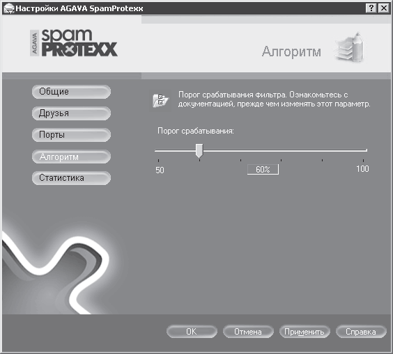 В разделе Алгоритм можно настроить чувствительность фильтра при помощи параметра Порог срабатывания (рис. 3.64). Чем больше его значение, тем больше писем SpamProtexx будет определять как спам. Разработчики программы рекомендуют изменять значение этого параметра, только если программа пропускает слишком много нежелательной корреспонденции.