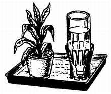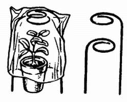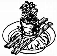 • Одним из способов поливки цветов на время отъезда хозяев является следующий: в полиэтиленовый мешок налить воду, в горловину поместить цветочный горшок (с отверстием внизу) и закрепить резинкой. Дно горшка не должно касаться поверхности воды. Испаряясь, вода будет увлажнять землю.