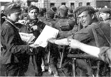 Корреспондент роты пропаганды фотографирует раздачу фронтовой газеты.