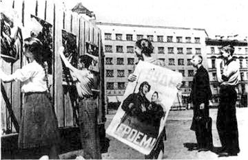 разделение авиаполков ВВС КОВО соответствовало господствовавшим на тот момент представлениям о роли и месте армейской авиации. Семь авиадивизий (14,15,16 и 63-я сад, 44-я и 64-я иад, 62-я бад), насчитывавшие 1360 самолетов, входили в состав армейской авиации, а четыре дивизии (17-я сад, 18-я дбад, 19-я бад, 36-я иад) и два разведывательных полка (643 машины) — в состав ВВС фронта. То есть 2/3 авиации округа были отданы в распоряжение командующих армиями, оставляя в распоряжении командования фронта только треть боевых машин. Соответственно, если оказывалась атакована одна из армий, в отражении удара принимали участие ВВС этой армии и ВВС фронта. Авиасоединения соседних армий быстро задействовать в интересах атакованной армии было бы проблематично.На стенах советских домов появляются пропагандистские плакаты.