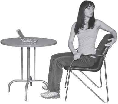 Делаем плавный поворот вправо, правой рукой держась за стул. Максимально поворачиваемся вправо и фиксируемся на 2–3 секунды. Затем возвращаемся в исходное положение. Также поворачиваемся в другую сторону.