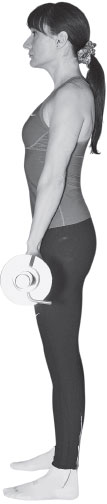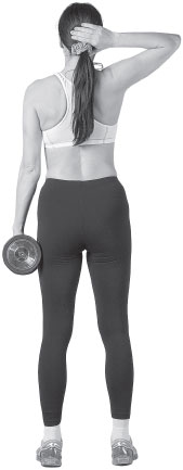 И. п.: стоя, держим в левой опущенной руке гантель, ноги на ширине плеч, правая рука на затылке.