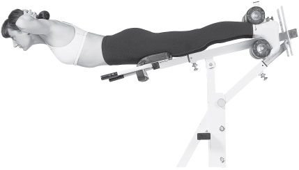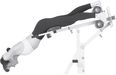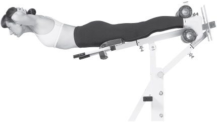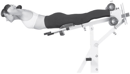 И. п.: лежа бедрами на станке, ноги закреплены, корпус удерживаем прямо, руки держим за головой.