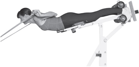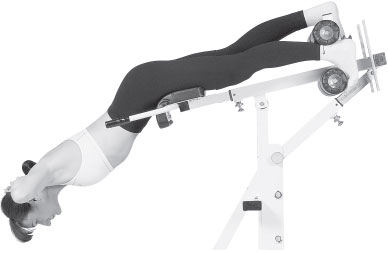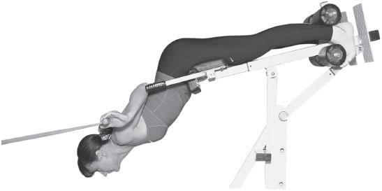 И. п.: лежа бедрами на станке, ноги закреплены, корпус удерживаем прямо, руками держимся за палку, прикрепленную к резиновым бинтам. Они закреплены напротив станка на расстоянии два метра.