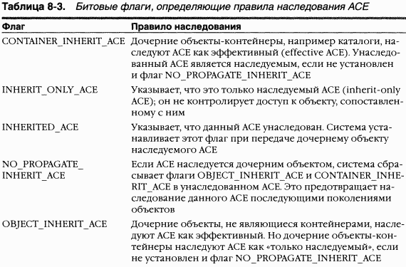 АСЕ, используемые в DACL, также имеют набор флагов, контролирующих и определяющих характеристики АСЕ, связанные с наследованием. Некоторые пространства имен объектов содержат объекты-контейнеры и объекты-листы (leaf objects). Контейнер может включать другие контейнеры и листы, которые являются его дочерними объектами. Примеры контейнеров — каталоги в пространстве имен файловой системы и разделы в пространстве имен реестра. Отдельные флаги контролируют, как ACE применяется к дочерним объектам контейнера, сопоставленного с этим АСЕ. Часть правил наследования ACE представлена в таблице 8–3 (полный список см. в Platform SDK).