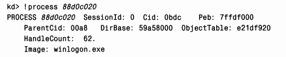 2. Введите !process 0 0, чтобы увидеть адрес Winlogon. (Если в системе активно более одного сеанса Terminal Server, выполняется несколько экземпляров Winlogon.) Затем вновь введите !process, но укажите адрес одного из процессов Winlogon: