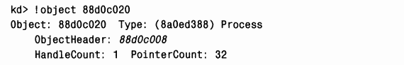 3. Введите !object и адрес, следующий за словом PROCESS в выводе предыдущей команды. Это позволит увидеть структуру данных объекта: