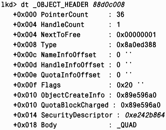 4. Введите dt _OBJECT_HEADER и адрес поля заголовка объекта из вывода предыдущей команды для просмотра структуры данных заголовка объекта, включая значение указателя дескриптора защиты: