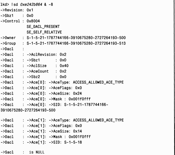 младшие три бита как флаги, поэтому следующая команда позволяет создать дамп дескриптора защиты. Вы указываете адрес, полученный из структуры заголовка объекта, но удаляете его младшие три бита:Дескриптор защиты содержит два ACE типа «доступ разрешен», причем один из них указывает учетную запись администратора (ее можно распознать по RID, равному 500), а другой — учетную запись System (которая всегда выглядит как S-l-5-18). Без декодирования битов, установленных в масках доступа в ACE и определения того, каким типам доступа к процессам они соответствуют, очень трудно сказать, какими правами доступа к объекту «процесс» для Winlogon обладает каждая из этих учетных записей. Однако, если вы сделаете это, используя заголовочные файлы из SDK, то обнаружите, что обе учетные записи имеют полные права доступа.