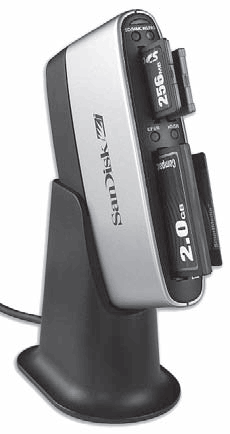 Если же вы захотите хранить и переносить информацию на флеш-карте, то для подключения ее к компьютеру необходимо приобрести специальное устройство, называемое картоводом (Card-Reader). Их выпускают фирмы-производители флеш-карт. Некоторые продвинутые модели картоводов поддерживают несколько типов флеш-памяти одновременно (рис. 6.10).