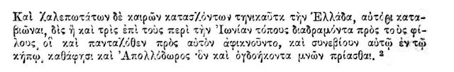 Также и Аполлодор(Аполлодор Афинский (II в. до н. э.) — древнегреческий писатель.) утверждает, что после самых тягостных бедствий и испытаний, дважды или трижды объехав Ионию и посетив там своих друзей, он снова поселился в Элладе. Друзья отовсюду съезжались к нему и проводили с ним время в его саду, который он купил за восемьдесят мин (греч.).