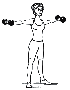 3. Стоя прямо, опустите руки с гантелями вдоль туловища. Медленно поднимите прямые руки в стороны до уровня плеч и опустить вниз. Повторите 10 раз (рис. 20).