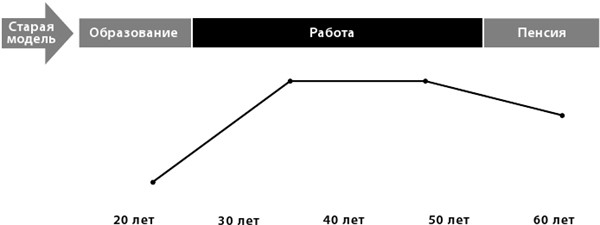В XXI веке, благодаря развитию технологий и увеличению продолжительности жизни, карьера перестает быть линейной и превращается из трехступенчатой в многоступенчатую. В XX веке жизненный путь большинства людей состоял из трех частей: образование, работа, пенсия (Рисунок 1). Продолжительность жизни ненамного превышала пенсионный возраст, пенсия была достаточно короткой, особенно в случае с российскими мужчинами. Работа часто была связана с одной-единственной компанией. Подобная практика существовала не только в СССР, где люди ожидали от своего работодателя помощи в получении жилья, организации летнего отдыха, медицинского обслуживания и других социальных льгот, но и в развитых капиталистических странах. В Германии, Франции и Японии в обмен на пожизненную лояльность сотрудники получали высокие корпоративные пенсии и защиту от увольнений.01