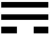 Все три черты – сильные. Триграмма в верхнем положении символизирует идеального правителя, в нижнем – благородного мужа. Если черты имеют свойство молодого ян – это великолепная комбинация. Но старый ян несет уже черты застоя. (Если мы рассматриваем тенденции возможных изменений. Ничто не замирает в неизменности, и в данном случае одна из черт рано или поздно изменится на прерванную. Вопрос – какая, и когда?) Нижняя черта символизирует сильную моральную позицию, “дэ”. Средняя черта – наличие ресурсов. Верхняя черта – наличие на службе профессионалов, а так же оружие, инструменты, средства производства.