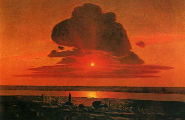 направления передвижников; могла говорить гордая мечта о создании своего направления, своей школы…Как бы то ни было, отныне Куинджи уже — не «товарищ». И в 1880 году впервые на Русипоявляется выставка отдельного художника,да притом еще не цикла произведений, а одной только картины… И картина эта трактовала не какой-нибудь грандиозный исторический сюжет, вроде брюлловской «Гибели Помпеи», а была лишь весьма скромным по размеру пейзажем… Это было смелое, пожалуй, даже дерзкое нововведение… Но смелость и на этот раз «взяла город»…