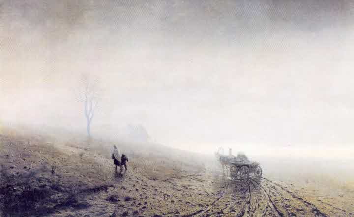 Вот эту-то эстетику, возводившую в принцип лишь реалистические сюжеты и мотивы, причем под таковыми разумелись сюжеты и мота вы будничные,«серенькие», — вот эту-то нарождавшуюся тогда школу искусства я и склонен считать тем властителем, в угоду которому временно изменил солнцу юга — а значит, отчасти и самому себе — наш при рожденный солнцепоклонник… Он, по-видимому, проникался господствовавшей тенденцией и, подобно остальным, а по бурности своего темперамента даже решительнее остальных пейзажистов наших, сосредоточивался на буро-серых тоннах, унылых мотивах и писал не залитые солнцем степи и море, а залитые дождем болотца, дороги, деревни…