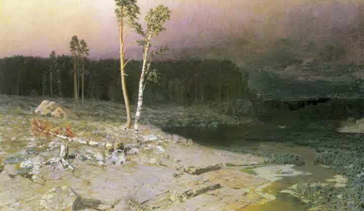 Как видите, наш южанин как бы начинает изменятьродному пейзажу, как бы покорен севером… О том же говорит и следующая картина 1873 года «Вид на о. Валааме», отправленная Академией на Венскую выставку: болото,