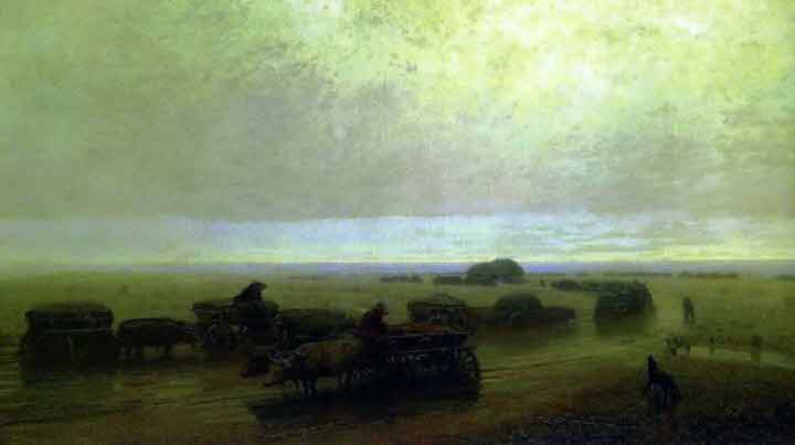 И из приведенных отзывов ясно, что молодой еще пейзажист — А.И. шел тогда 34-й год — уже успел завоевать зрителя: его ставили рядом с признанными авторитетами, людьми предшествовавшего поколения, как Шишкин и Клодт, а то и выше их… Очевидно, те новшества, которые вносил в пейзаж Куинджи, являлись уже назревшим, уже необходимым шагом вперед. Но если одна сторона этих новшеств — лиризм, которым были проникнуты его пейзажи — была, действительно, подготовлена деятельностью Саврасова и Васильева, если здесь он продолжал начатое ими движение, то обобщенная манера письма и зачатки импрессионизма, на которые правильно указывает одна из приведенных цитат, являлись подлинным новшеством и самостоятельным вкладом Куинджи в наше искусство. В этой области он у нас был зачинателем, истинным новатором.