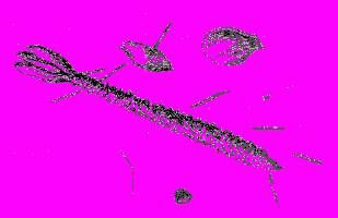 Стержень еловой шишки и отдельные чешуйки, упавшие на снег под деревом, на котором кормилась белка. Зверек срезает чешуи у самого стержня шишки. Тут же один "орешек" помета (е. в.). При питании полноценным семенным кормом помет у белки мелкий