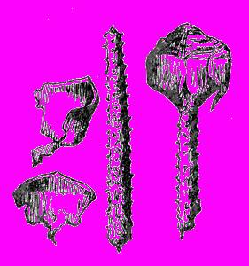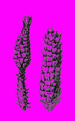Слева - стержень еловой шишки, сброшенной на землю клестами, которую грызла сначала белка, а затем лесные полевки, Справа - стержень, обработанный лесными полевками (ум.)