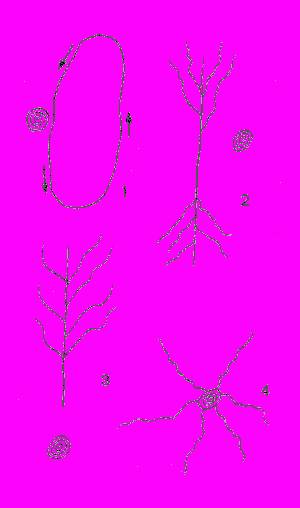 Схемы следов белок, нарисованные тунгусом-охотником: / - след белки, идущей по кругу; 2 - след белки, делающей тропу в две стороны, приходящей в гайно и уходящей из него по деревьям; 3 - след белки, делающей прямую тропу и попадающей в гайно по деревьям; 4 - след белки, делающей тропы во все стороны от гайна. Гайно обозначено кружочками