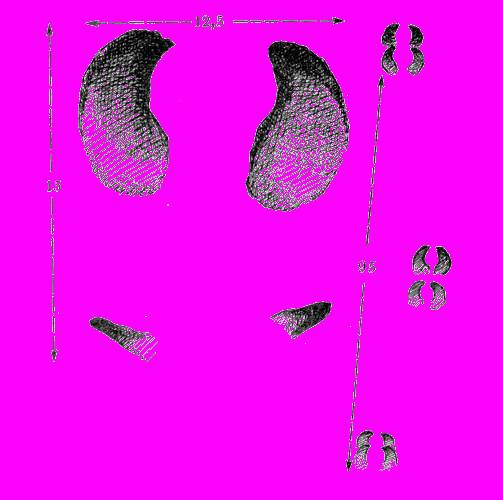 их обычного соседа - кабана. Но у кабана более длинные боковые пальцы чаще оставляют отпечатки, а два средних раздвигаются шире, чем у оленей. По следам туловища на траве, кустах и деревьях (кабан гораздо ниже оленя), по помету часто удается проверить определение, сделанное по отпечаткам копыт.Помет оленей, как и у лося,- характерные "орешки", лежащие обычно большой кучкой. Они мельче лосиных, но крупнее, чем у косули. Следы оленя-быка, в особенности отпечатки задних ног, крупнее, тупее и более округлые, чем у самки, а отпечатки копыт теснее сжаты. Кроме того, следы правой и левой пар конечностей -быка значительно дальше отодвинуты в стороны от средней продольной линии следа.