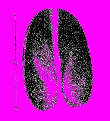 Следы оленя на ходу: слева - самки, справа - самца. У последнего промежуток между правыми и левыми отпечатками (см. пунктир) много шире, чем у самки