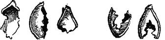 Семена тыквы, поеденные тушканчиками: слева - большим тушканчиком (обгрызает шов, почти не трогает створки); справа - малым земляным зайчиком (не трогает шва, прогрызает отверстие со стороны створок), по Б. К. Фенюку. Волгоградская обл.
