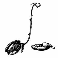 Слева - молодой сеянец дуба с перегрызенным корнем, выкопанный малым сусликом. Одна семядоля съедена, побег засох. Справа - выкопанная из лунки, очищенная от скорлупы и частично погрызенная семядоля проросшего желудя (ум.). Посевы полезащитных полос, Камышин, июнь