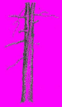Засохший дуб около двух обхватов толщиной. В средней щели ствола на высоте 4,5 м дневное убежище 65 самок летучих мышей - водяных ночниц. Воронежский заповедник, май