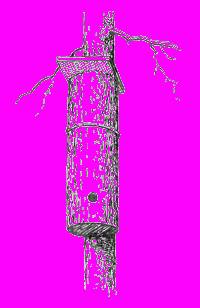 Дуплянка для рыжих вечерниц, водяных ночниц и других видов летучих мышей. Полость дупла расположена выше летка. Леток 4,5-6 см в диаметре. Такие дуплянки вешают в лесу на просеках и полянах на высоте 4-8 м от земли