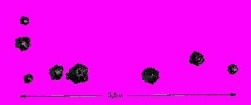 План расположения вулкановидных, или шапковидных, кучек земли над ходом крота на лесном лугу. Диаметр основания кучек 10-45 см (изредка до 75 см). Интервалы между кучками 50-80 см, реже до 120-150 см. Окрестности Москвы, апрель