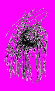 Шаровидное гнездо мыши-малютки в листьях крупной осоки и злаков на заболоченной степной западине (ум.). Окрестности Атбасара, Казахстан, август