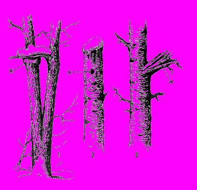 Разные типы дупел с гнездами белок: слева - в дубе на месте повреждения ствола сучком соседнего дерева; в середине - дупло в осине, сделанное большим пестрым дятлом; справа - в полости излома бокового ствола осины. Горьковская обл.