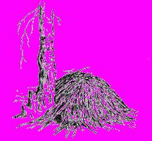 Небольшой стожок ирисового сена у ствола березы - запас даурской сеноставки. Под стожком - вход в нору. Север Монголии