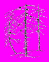 Часть грибного запаса белки, развешанного на молодых елочках. Общее число грибов в запасе было около 250, они располагались
