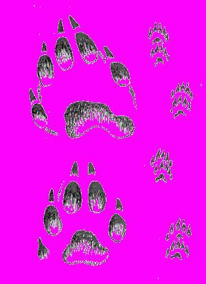 Отпечатки передней (вверху) и задней лап росомахи (сильно ум.). Справа - след на медленном ходу
