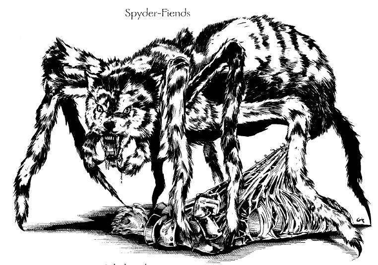 Пол пещеры треснул, и оттуда показалась примерзкая чёрная огромная тварь. Помесь волка и паука. Морда волчья, а вот задние лапы и нижняя часть тела паука. Ещё и ядом плюется. Хотя что ещё ожидать от этого странного разлома.