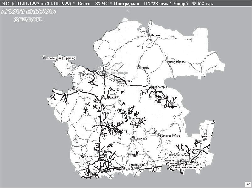 Ранее уже говорилось, что Excel предъявляет к картам довольно жесткие требования. Предлагаемая технология использования гиперссылок, напротив, допускает работу с любой картой в любом формате, если ее можно вывести на экран монитора. Затем надо сделать снимок карты с помощью таких программ, как Adobe PhotoShop, Screen Print Gold, HyperSnab-DxPro и др. (которые не входят в состав Microsoft Office). Теперь можно конвертировать карту в любой нужный графический формат. Чтобы впоследствии у вас не возникало трудностей в работе с картой в Access 2002, поместите ее из полученного файла в окно, открытое в Word 2002. Карта будет иметь формат DOC. Конвертированные таким образом файлы показаны на рис. 4.39 (для Архангельской области) и 4.40 (для Ленинградской области).