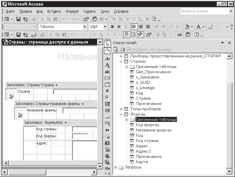 Возможно, вы захотите внести в нее какие-то коррективы. Это можно сделать как раз в режиме конструктора, о чем будет сказано чуть ниже. Пока же отметим самое важное: если на настоящем этапе работы вы не воспользовались возможностью упорядочить данные, то какие бы правки ни вносились в форму в режиме конструктора, общая структура страницы сохранится неизменной. Листать ее вы сможете только по фирмам, и переход к другой стране будет происходить лишь тогда, когда вы будете просматривать данные по другой фирме.