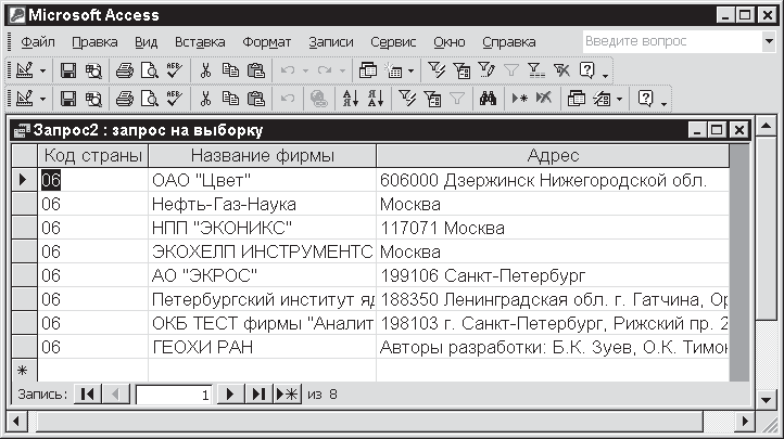 В данном примере нас будут интересовать три поля: Код страны, Название_фирмы_ и Адрес. Введите их названия в бланк запроса, как вы уже делали это раньше. Чтобы отобрать именно российские фирмы, воспользуйтесь новым элементом – критерием. Он вводится в строке бланка, которая так и называется – Условие отбора. В нашем случае критерий следует указать в единственном поле таблицы Фирмы, связанном со страной, – Код страны. Здесь вы вводите условный код России – 06 (см. рис. 11.12).